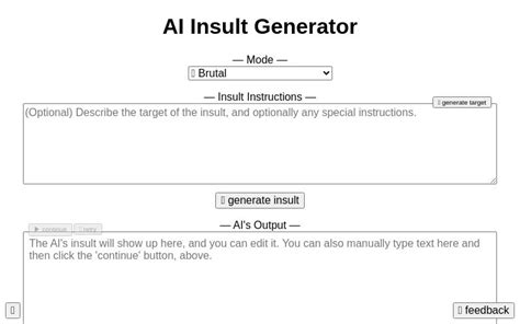Ai Insult Generator. Web artificial intelligence generated insults. Get ready to be insulted by: