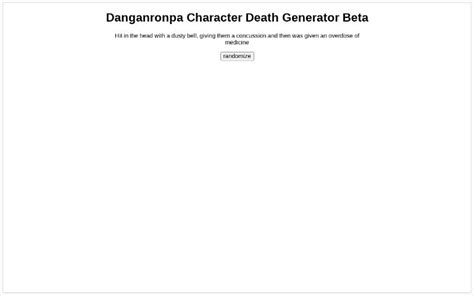 Character Death Generator. Web automatic cause of death generator tool. Generate a simple scenario between any two characters to create a dynamic scene.