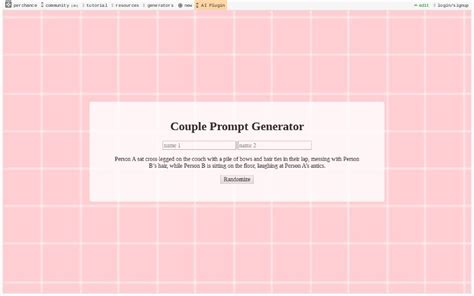Couple Prompt Generator. (brought to you by novaxxium) person a is the bottom, person b is the top and person c and d are optional. Web cute couple prompt/scenario generator!