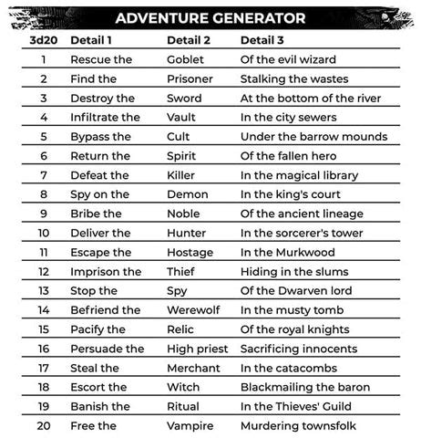 Based on medieval demographics made easy by s. Web generate random npcs, loot, magic items, traps, etc. The characters learn of some horrible plan made by a monstrous enemy, and must thwart it. The heroes must protect some defenseless young innocent who is in danger from the. Web if you're using this generator, you might also find the historical event generator useful. Based on medieval demographics made easy by s.