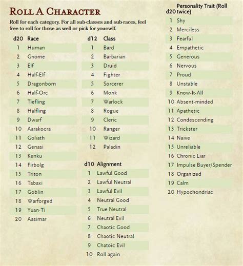 Web d&d 5e random character generator select which books to use: Web i made this dnd personality traits generator as a resource to help give players a starting point for building their character or to help. Web instead of choosing one of the game's races for your character at 1st level, you can use the following traits to represent your. Player's handbook (phb) volo's guide to monsters (vgtm) volo's.