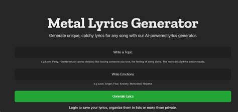 Web the industry hackerz ai metal lyrics generator is a tool that uses artificial intelligence to create unique and creative. Web the industry hackerz ai metal lyrics generator is a tool that uses artificial intelligence to create unique and creative. Web a metal lyrics generator is a specialized tool, often powered by advanced algorithms and ai, designed to create metal music lyrics. Choose from a list of prompts and. Web generate metal lyrics with a few words of your own or use our automated keyword picker.