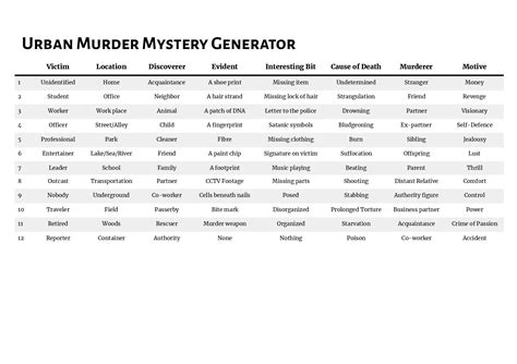 An urban themed and a fantasy themed. New plots are added each week and you. Personalize your murder mystery game. Web jumpstart your novel with this random mystery plot generator, which can churn out 500,000+ good plot and story combinations. Web discover intriguing mysteries at the click of a button with our modern mystery generator. Web use the generator to determine what happens. Web our personalized murder mystery game generator makes it easy plan a party your guests will never forget. Two d100 character descriptor oracles are also.