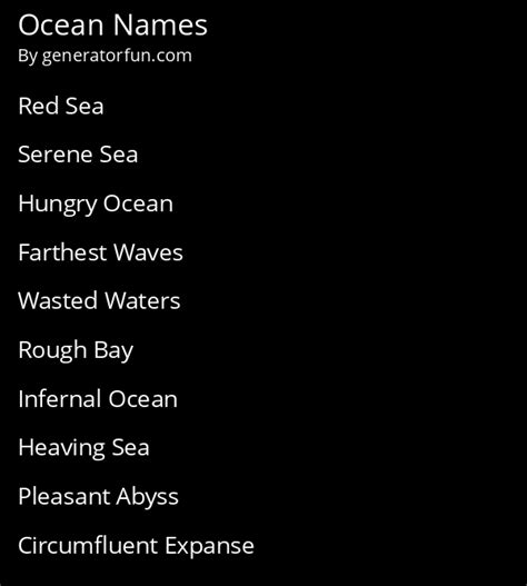 Ocean Name Generator. Generate thousands of random ocean names with this ocean name generator ⚡️ ideas can be saved and copied ⚡️ fuel your creativity. Beautiful ocean and sea names should inspire a sense of wonderment in your players or readers, as such they tend to be.
