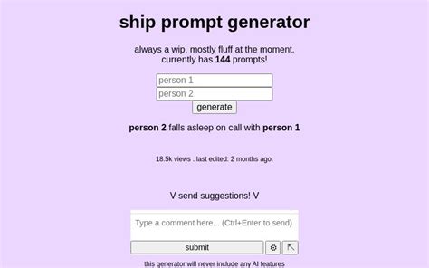 Ship Prompt Generator. Bonus points for mutual pining. There are three different generators, that i will be adding to periodically.